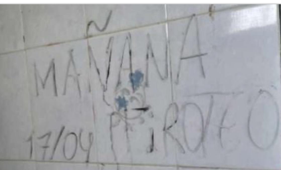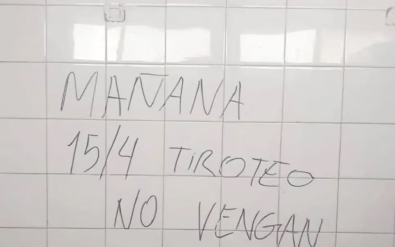 Otra aparecida en un baño reza: “Tiroteo mañana”, esta ultima fue descubierta este jueves en uno de los baños del Colegio Fasta- la otra en el Pia y movilizó al área de investigación de la Policía que este viernes controlará los accesos a los colegios- eldiariodecatamarca.com