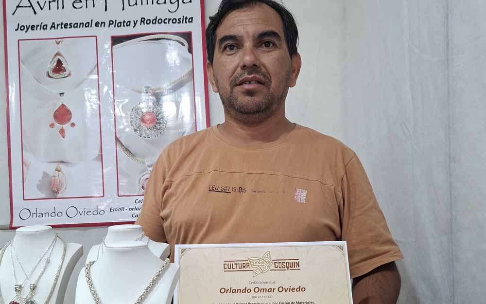 Se trata del artesano Orlando Oviedo, que fue distinguido por la organización de la 59º Feria Nacional de Artesanías y Arte Popular "Augusto Raúl Cortázar" de Cosquín. La pieza premiada combina rodocrosita con plata además es el segundo año consecutivo que es premiado por su trabajo. –eldiariodecatamarca.com