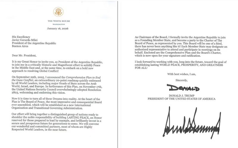 Según detalló Milei, la invitación se formalizó a través de una carta enviada por el presidente estadounidense. “Es un gran honor para mí invitarle, como presidente de la República Argentina, a unirse a mí en un esfuerzo histórico y magnífico para consolidar la paz en Oriente Medio y, al mismo tiempo, emprender un nuevo y audaz enfoque para resolver el conflicto global”, expresó Trump en el texto.