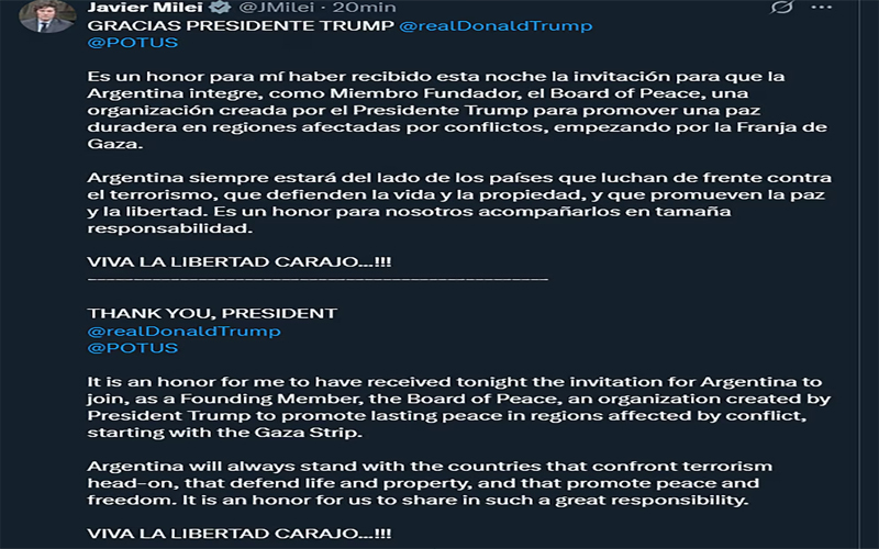 “Es un honor para mí haber recibido esta noche la invitación para que la Argentina integre, como Miembro Fundador, el Board of Peace”, escribió Milei en su mensaje, en el que precisó que se trata de “una organización creada por el Presidente Trump para promover una paz duradera en regiones afectadas por conflictos, empezando por la Franja de Gaza”.