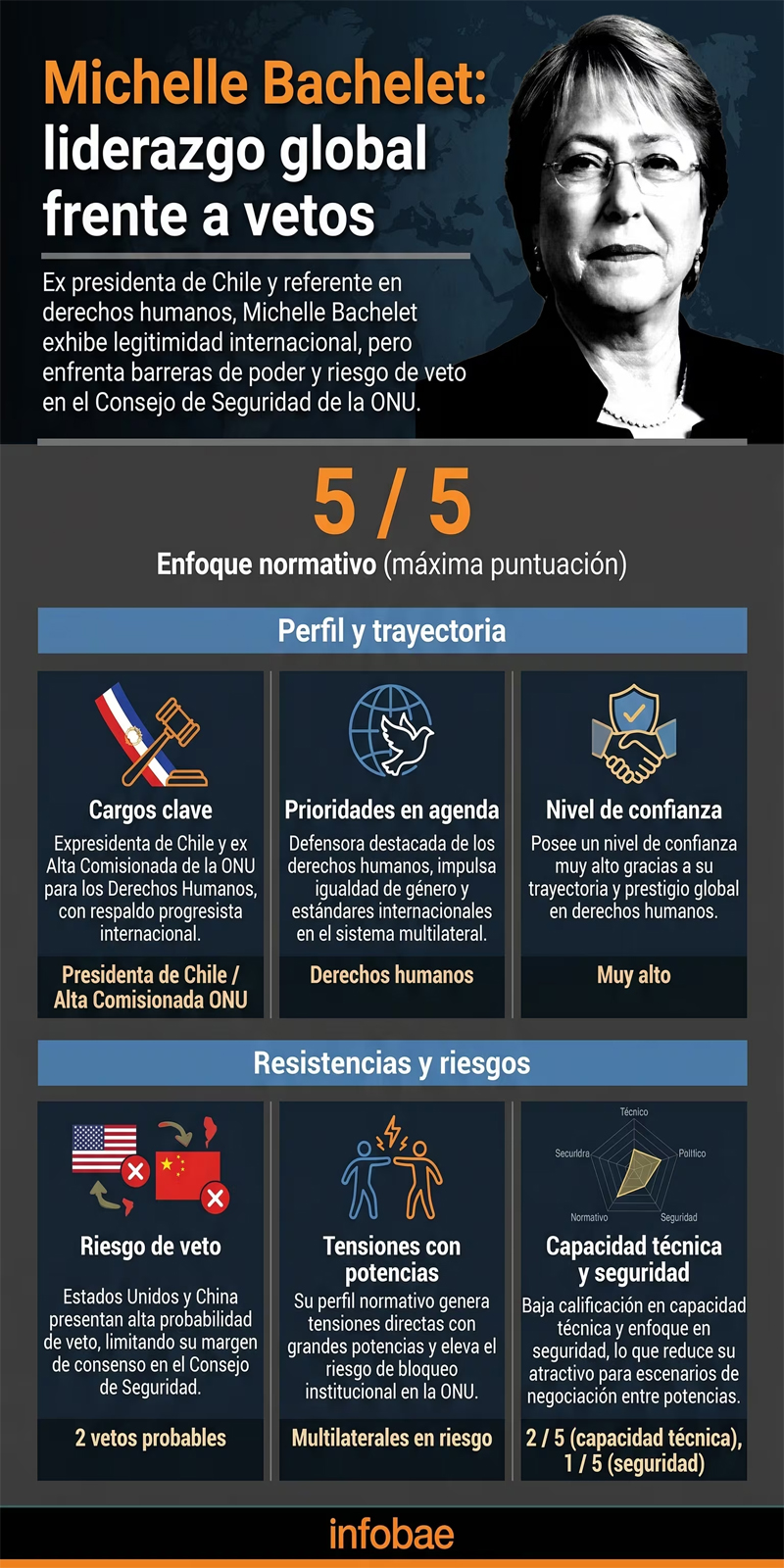 Con amplia experiencia internacional, fue directora ejecutiva de ONU Mujeres y alta comisionada de la ONU para los Derechos Humanos, donde su informe sobre la minoría uigur generó tensiones con China.