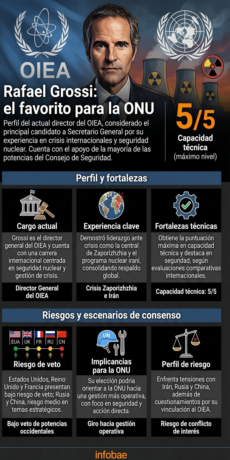 Diplomático de carrera, Grossi, de 65 años, dirige desde 2019 el Organismo Internacional de Energía Atómica (OIEA), donde ha gestionado crisis nucleares como el programa iraní y la situación en la planta de Zaporizhzhia bajo ocupación rusa.