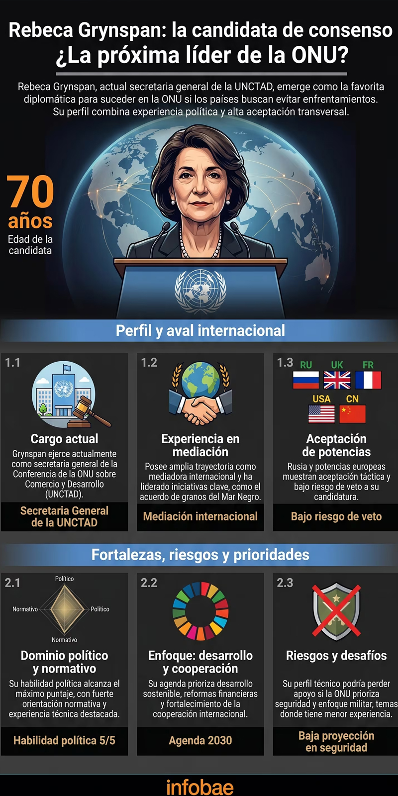De 70 años, economista y ex vicepresidenta costarricense, Grynspan dirige actualmente la Conferencia de las Naciones Unidas sobre Comercio y Desarrollo (UNCTAD). Hija de sobrevivientes del Holocausto, negoció la Iniciativa del Mar Negro entre Rusia y Ucrania para facilitar la exportación de cereales durante la guerra.