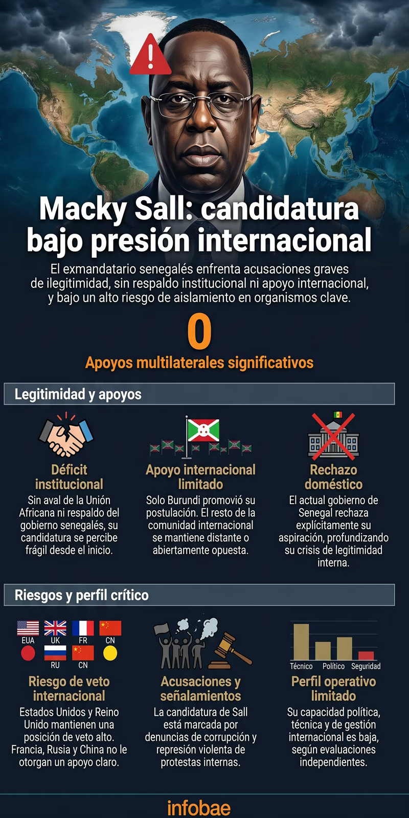 El ex presidente senegalés, de 64 años, es el único aspirante africano. Gobernó Senegal de 2012 a 2024 y sostiene que la paz global solo es posible si se abordan la pobreza, las desigualdades y la vulnerabilidad climática.