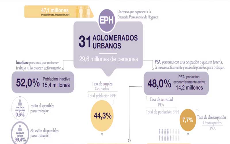 A su vez, el INDEC indicó que la tasa de actividad –que mide la población económicamente activa (PEA) sobre el total de la población– alcanzó el 48%; mientras que la tasa de empleo –que mide la proporción de personas ocupadas con relación a la población total– se ubicó en 44,3%.