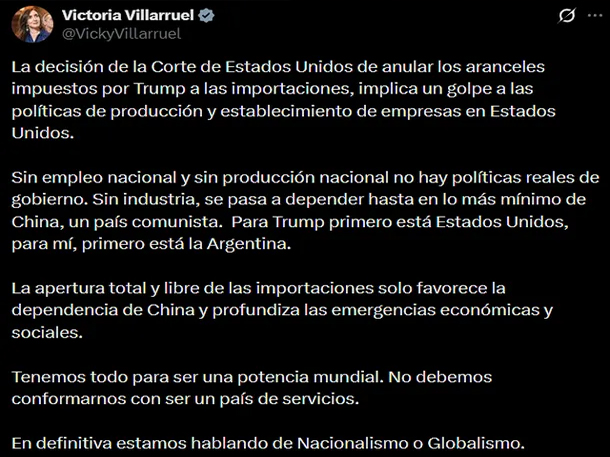 Sus declaraciones se conocieron el mismo día en que la Corte Suprema de Estados Unidos anuló la mayoría de los aranceles globales fijados por Donald Trump. A través de su cuenta en X, Villarruel planteó una defensa explícita de las medidas proteccionistas adoptadas por el exmandatario estadounidense y cuestionadas por el máximo tribunal de ese país.